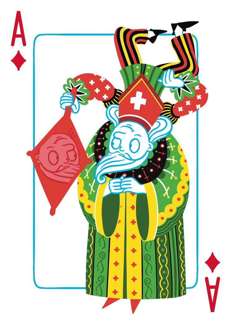 Description: On the face cards of the 'About Face' deck, reversible heads lie at the centre with the familiar symmetrical bodies at the top and bottom. Thus rotating the face cards reveals new characters. I started About Face in June 2023, and aim to produce the deck by the end of 2024.